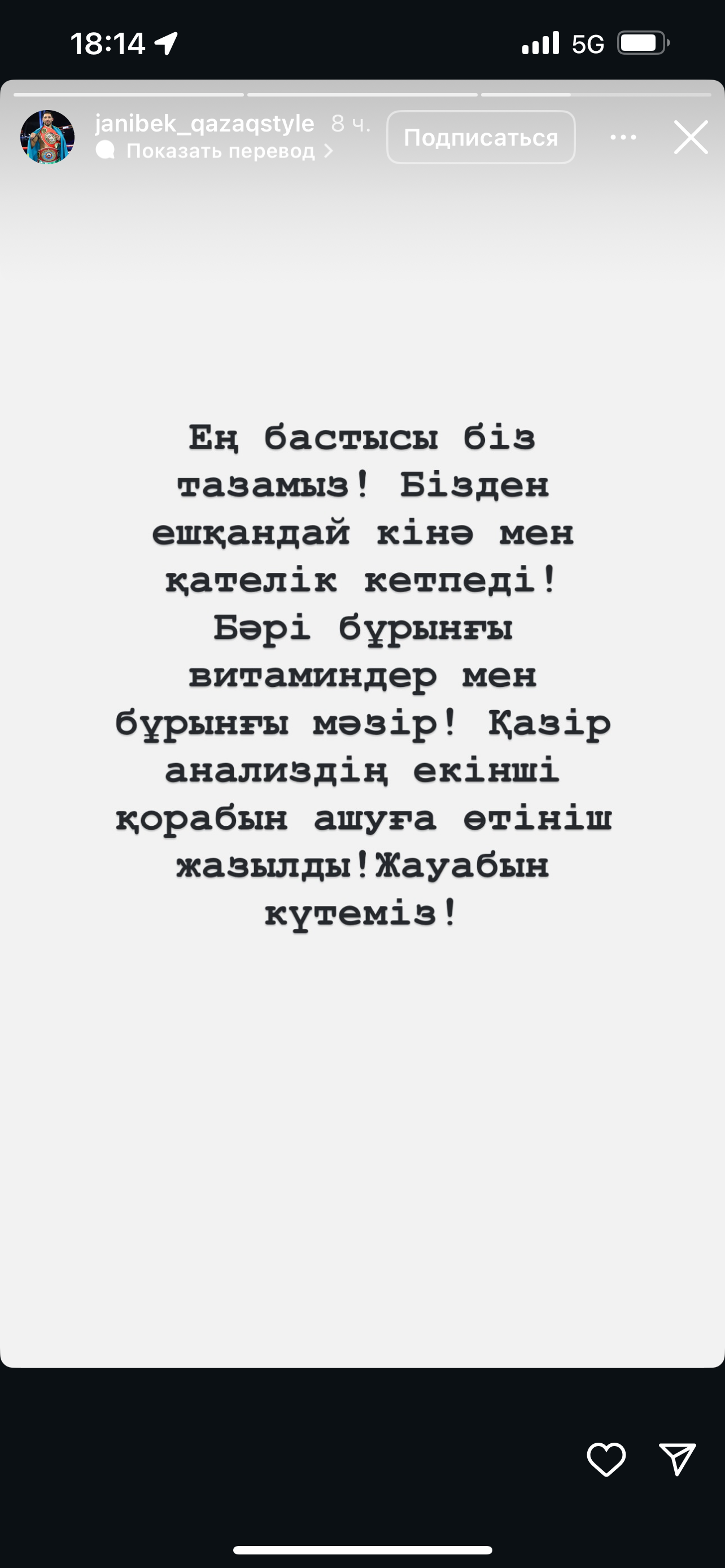 Допинг дауына іліккен Жәнібек Әлімханұлы қолдау көрсеткен жанкүйерлеріне алғыс білдіріп, командасының кінәсі жоқ екенін айтты.