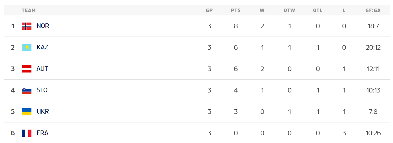 Антон Васин бастаған команда Украинда овертаймда жеңіліп, Словенияны буллиттер сериясында ұтып, Францияны ірі есеппен жеңді. Қазір құрама қоржынында 6 ұпай бар.
