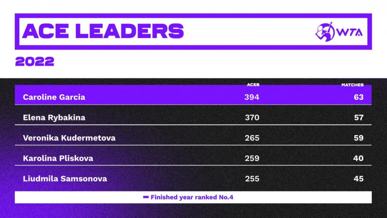 Елена Рыбакина осы маусымдағы 57 кездесуінде 370 эйс жасаған. Ал бұл рейтингте WTA маусымы қорытынды турнирінің жеңімпазы франциялық теннисші Каролин Гарсия көш бастап тұр. Ол 63 матчта 394 эйс жасаған. Ресейлік Вероника Кудерметова үздік үштікті түйіндеп тұр - 59 кездесуде 265 эйс.